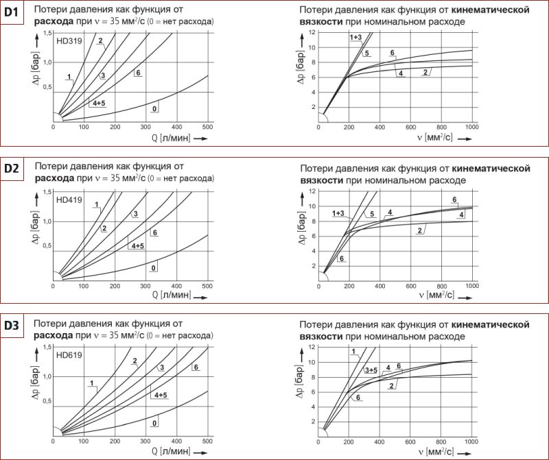 - при первом пуске: Рекомендуемую вязкость при пуске можно найти по диаграмме D (зависимость потерь давления от кинематической вязкости) следующим образом: найдите 70 % ∆p давления срабатывания перепускного клапана. Проведите горизонтальную линию так, чтобы она пересекала кривую ∆p в одной точке.