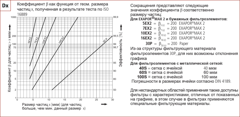 значения коэффициента β согласно ISO 16889 (см. таблицу подбора, столб. 4 и диаграмму Dx)
